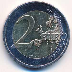 Bi-Metallic Nickel-Brass center in Copper-Nickel ring. Obv: Female head in national costume right. Rev: Value and map, stars and lines.