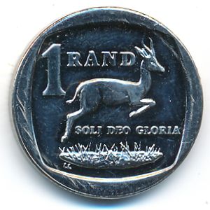 KM#444 ЮАР, 1 рэнд Медь, покрытая никелем, 20 мм, 4 г Категории: Животные. Спрингбок, или антилопа-прыгун — африканская антилопа из подсемейства настоящих антилоп. Информация о выпуске (подробности в каталоге):