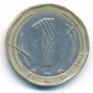 KM#254 Болгария, 1 лев (2002 г.) Биметалл, 24.3 мм, 7.03 г Категории: Без тематики, Выдающиеся личности, Юбилейные. Аверс: Образ Святого Ивана Рыльского, святого Болгарской Церкви, наиболее почитаемого святого покровителя болгарского народа. Смотрите подробное описание типа в каталоге.